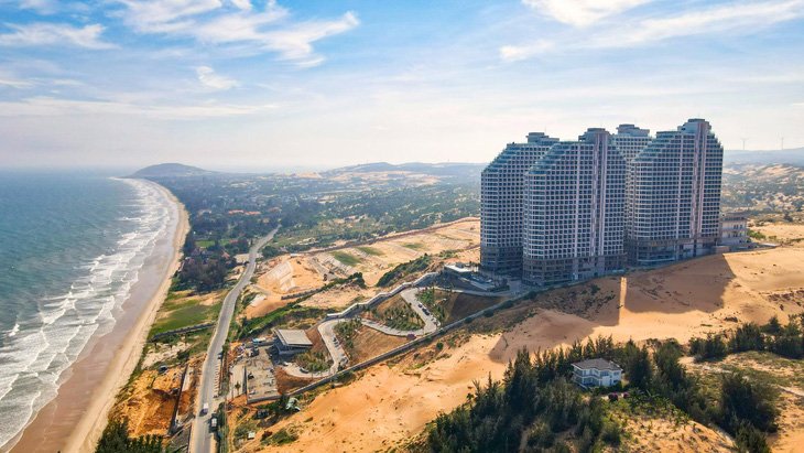 Siêu phẩm Apec Mandala ôm trọn bãi biển đẹp của Mũi Né với tổng quy mô lên đến 4,5 ha gồm 2.962 căn hộ. Đặc biệt, dự án được xây dựng trên đồi cát cao, lối thiết kế giật cấp đầy ấn tượng. Điểm nhấn này giúp 100% căn hộ đều có tầm nhìn hướng biển, hưởng trọn gió mát từ biển cả thổi vào.