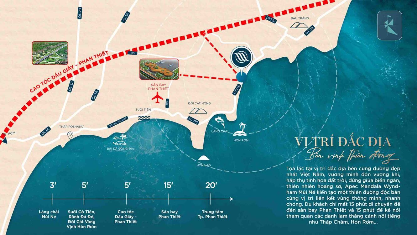 Đặc biệt, với tuyến khi tuyến cao tốc Dầu Giây – Phan Thiết hoàn thành, thời gian di chuyển đến Apec Mandala Wyndham Mũi Né sẽ được rút ngắn đáng kể: