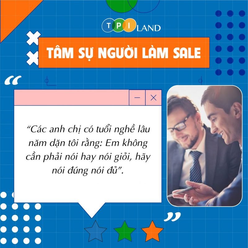 Làm sale BĐS cần phải biết đặt câu hỏi đúng, lắng nghe thu thập thông tin, phù hợp. Khách hàng không có nhiều thời gian, chính vì khoảng thời gian ngắn nên tôi phải đánh trúng vấn đề, trúng điều họ quan tâm. Và nhờ chăm chỉ học hỏi cộng kinh nghiệm thực tế từ thành công thất bại mà tôi biết cách tư vấn đúng, đoán trúng được khách cần gì và tạo được sự tin tưởng. Gây được thiện cảm với khách, nhờ thế hợp đồng cũng dễ chốt hơn. Hồi xưa tính tôi cũng hay nói thẳng, dễ làm mất lòng người khác, nhưng nghề này đã cho tôi sự kiên trì cao.